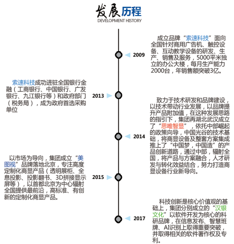 2009年,集團(tuán)成立品牌“索速科技”面向全國針對(duì)商用武漢廣告機(jī)、觸控設(shè)備、互動(dòng)教學(xué)設(shè)備的研發(fā)、生產(chǎn)、銷售及服務(wù),5000平米獨(dú)立的辦公大樓,每月生產(chǎn)能力2000臺(tái),年銷售額突破5000萬;